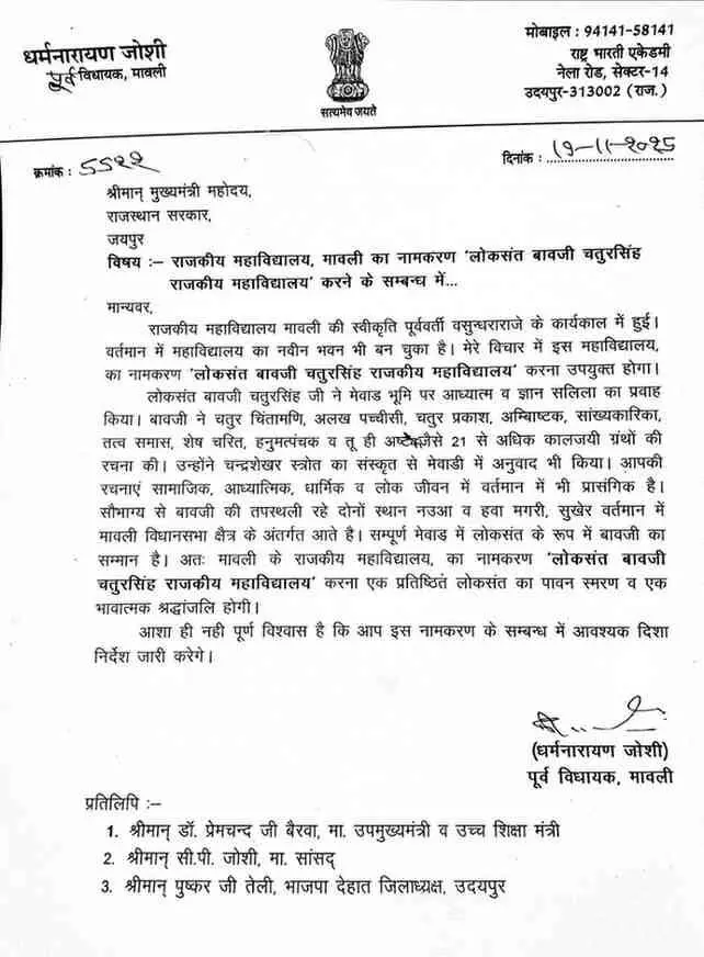 मावली के पूर्व विधायक धर्मनारायण जोशी ने मुख्यमंत्री भजनलाल शर्मा को पत्र लिखकर मावली के राजकीय महाविद्यालय का नाम लोकसंत बावजी चतुरसिंह के नाम पर करने की मांग की। जोशी ने उनके साहित्यिक और आध्यात्मिक योगदान का उल्लेख करते हुए इसे क्षेत्रीय विरासत और भावनात्मक श्रद्धांजलि बताया।