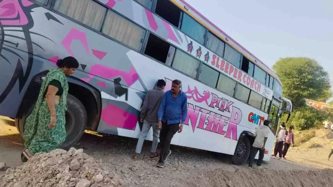 झाड़ोल–गोगुंदा रोड पर उंडासिया नदी की क्षतिग्रस्त पुलिया पर एक वीडियो कोच बस ग्रेवल में धंसकर अचानक झुक गई, लेकिन चालक की सूझबूझ से सभी यात्री सुरक्षित बच गए। भारी बारिश के बाद पुलिया की मरम्मत लंबे समय से लंबित है, जिसके कारण बड़ा हादसा टलते-टलते बचा। घटना से क्षेत्र में सुरक्षा को लेकर चिंता बढ़ी।