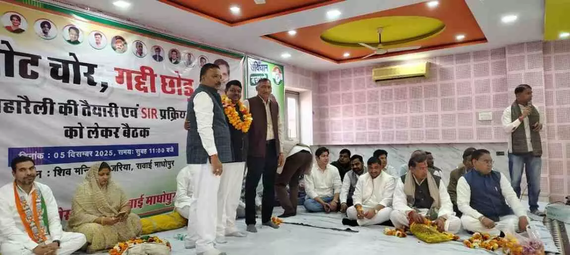 सवाई माधोपुर जिला कांग्रेस कमेटी की बैठक में अन्नदाता आक्रोश रैली और 14 दिसंबर 2025 को दिल्ली में होने वाली ‘वोट चोर गद्दी छोड़’ रैली की तैयारियों पर विस्तृत चर्चा की गई। पूर्व जिलाध्यक्ष गिर्राज सिंह गुर्जर ने कार्यकर्ताओं को संगठित होकर बड़े स्तर पर भागीदारी सुनिश्चित करने का आह्वान किया।