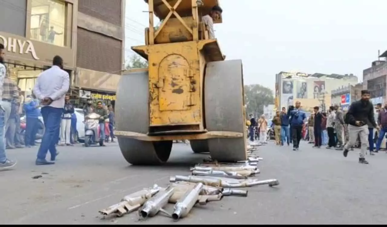 भीलवाड़ा में मॉडिफाइड बुलेट साइलेंसरों पर चला बुलडोजर, 150 जब्त कर नष्ट किए