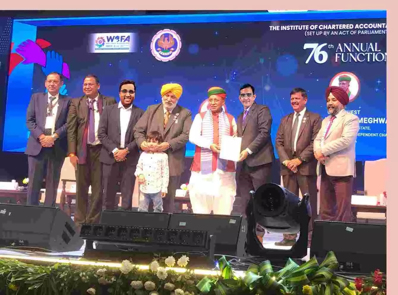 आईसीएआई के 76वें वार्षिक समारोह में केंद्रीय मंत्री अर्जुन राम मेघवाल ने पंकज जोशी को राष्ट्रीय स्तर पर प्रथम स्थान प्राप्त करने पर सम्मानित किया।