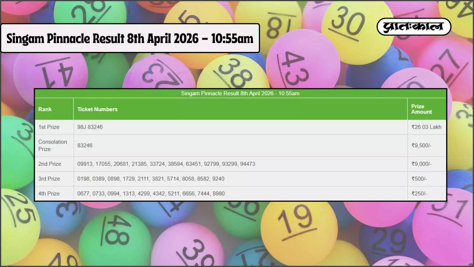 Singam Pinnacle Lottery 8 अप्रैल 2026 सुबह 10:55 बजे के नतीजे घोषित! टिकट संख्या 98J 83246 ने जीता ₹26.03 लाख का बंपर इनाम। देखें विजेताओं की पूरी सूची।