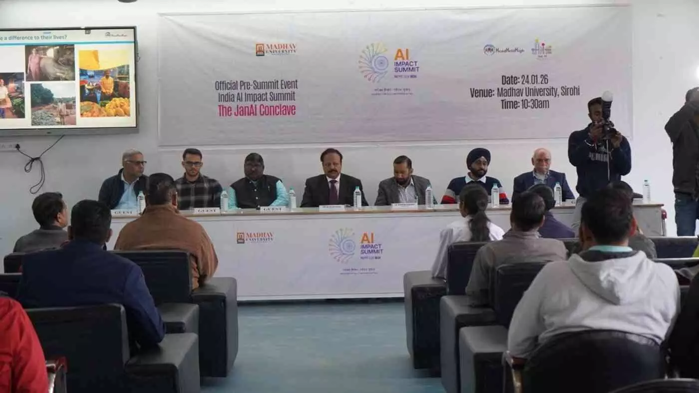सिरोही के माधव विश्वविद्यालय में आयोजित 'जनएआई कॉन्क्लेव–2026' ने ग्रामीण भारत के लिए डिजिटल क्रांति का मार्ग प्रशस्त किया है। हेड हेल्ड हाई फाउंडेशन के सहयोग से हुए इस भव्य आयोजन में एआई के माध्यम से कृषि, शिक्षा और महिला सशक्तिकरण पर विशेषज्ञों ने मंथन किया। चांसलर हिम्मत सिंह देवल सहित कई दिग्गजों की उपस्थिति में 'जन एआई ग्राम सेतु' और 'डिजिटल स्वदेशी आंदोलन' जैसी अवधारणाओं के साथ ग्रामीण विकास की नई रूपरेखा तैयार की गई।