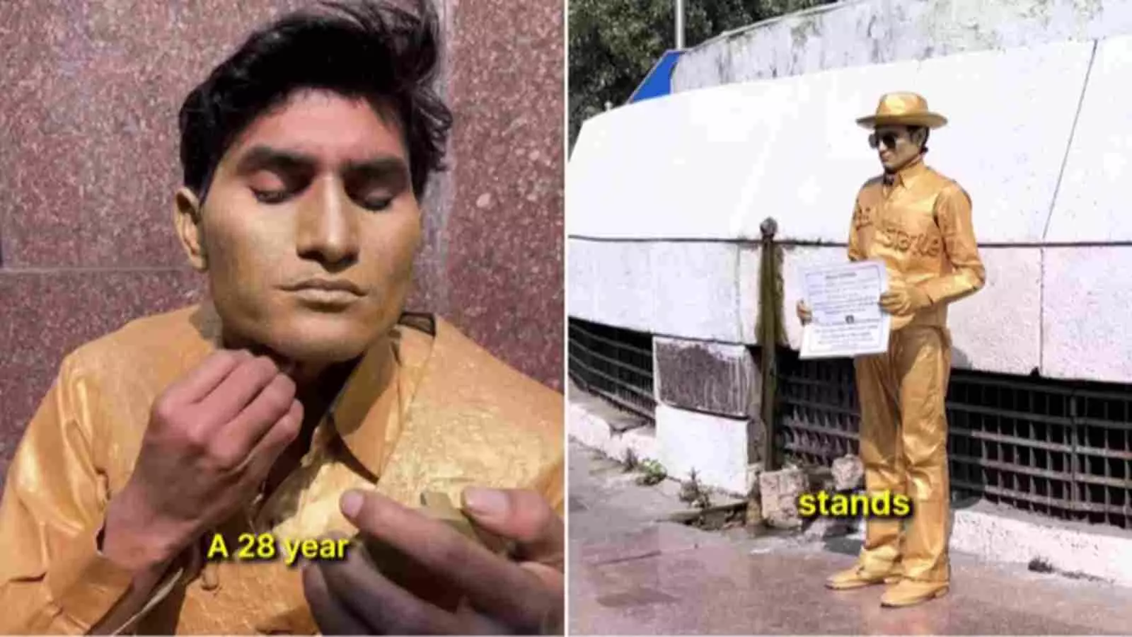ठेकेदारी में भारी घाटे और दोस्त के धोखे के बाद 28 वर्षीय रजनीश परिवार पालने के लिए रोज 12 घंटे 'गोल्डन स्टैच्यू' बनकर खड़े रहते हैं।