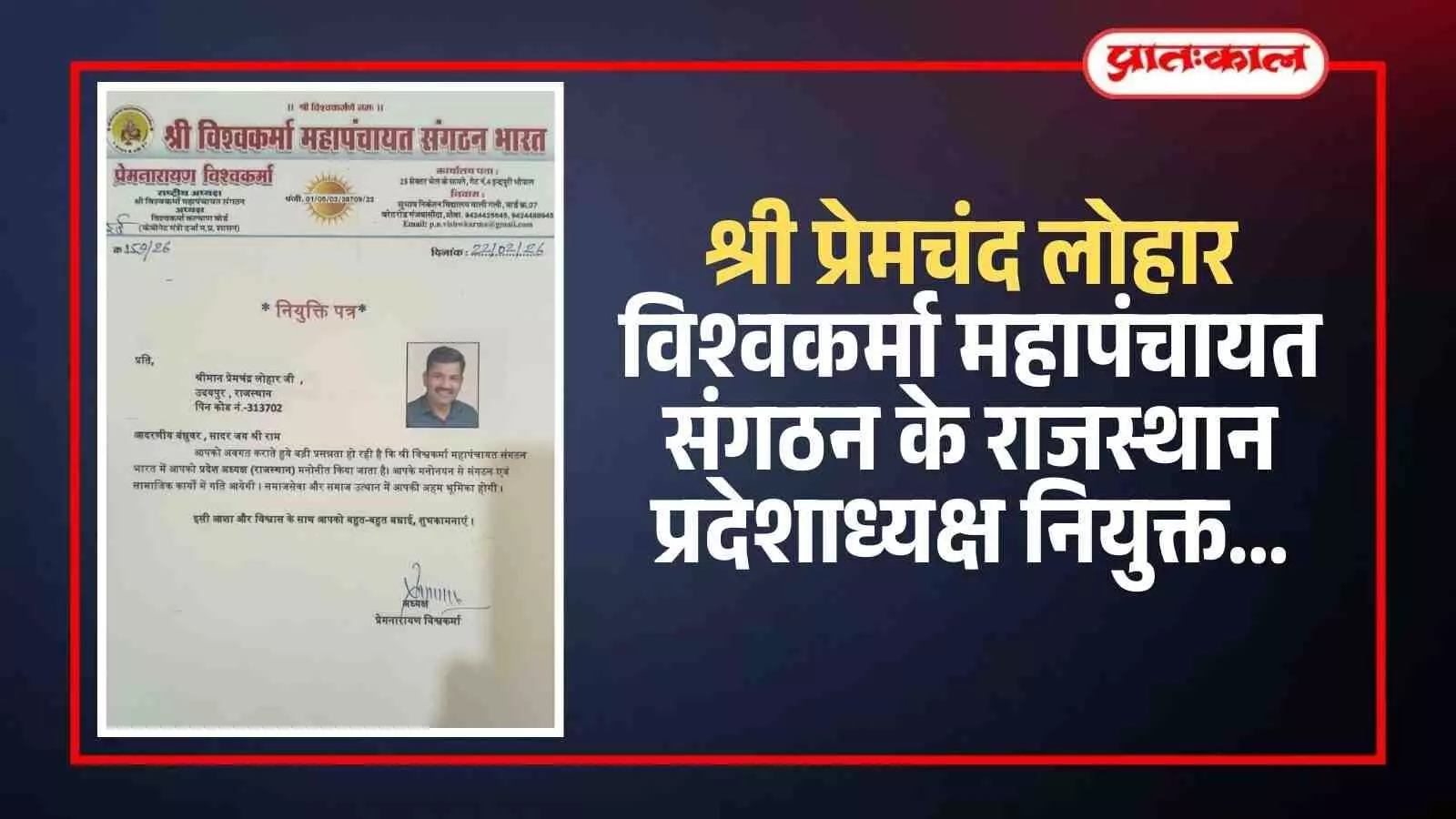 संगठन के राष्ट्रीय अध्यक्ष प्रेम नारायण विश्वकर्मा ने उदयपुर के झाड़ोल निवासी प्रेमचंद लोहार को प्रदेश की कमान सौंपी, कार्यकर्ताओं में खुशी का माहौल।